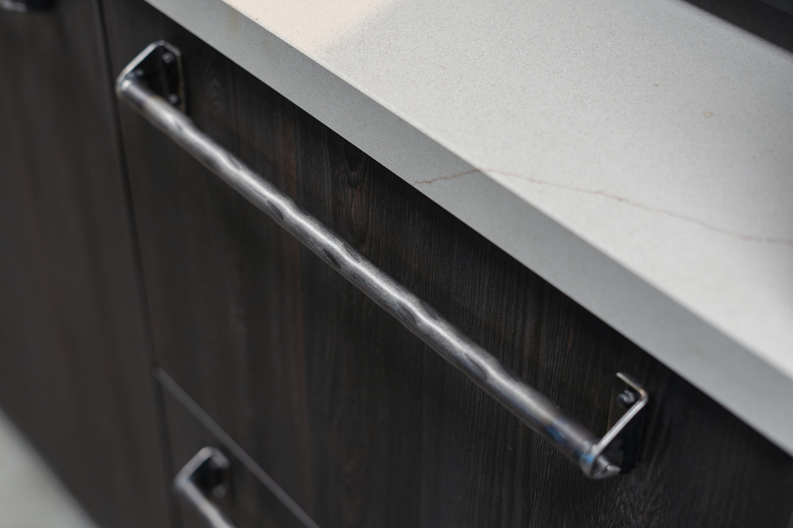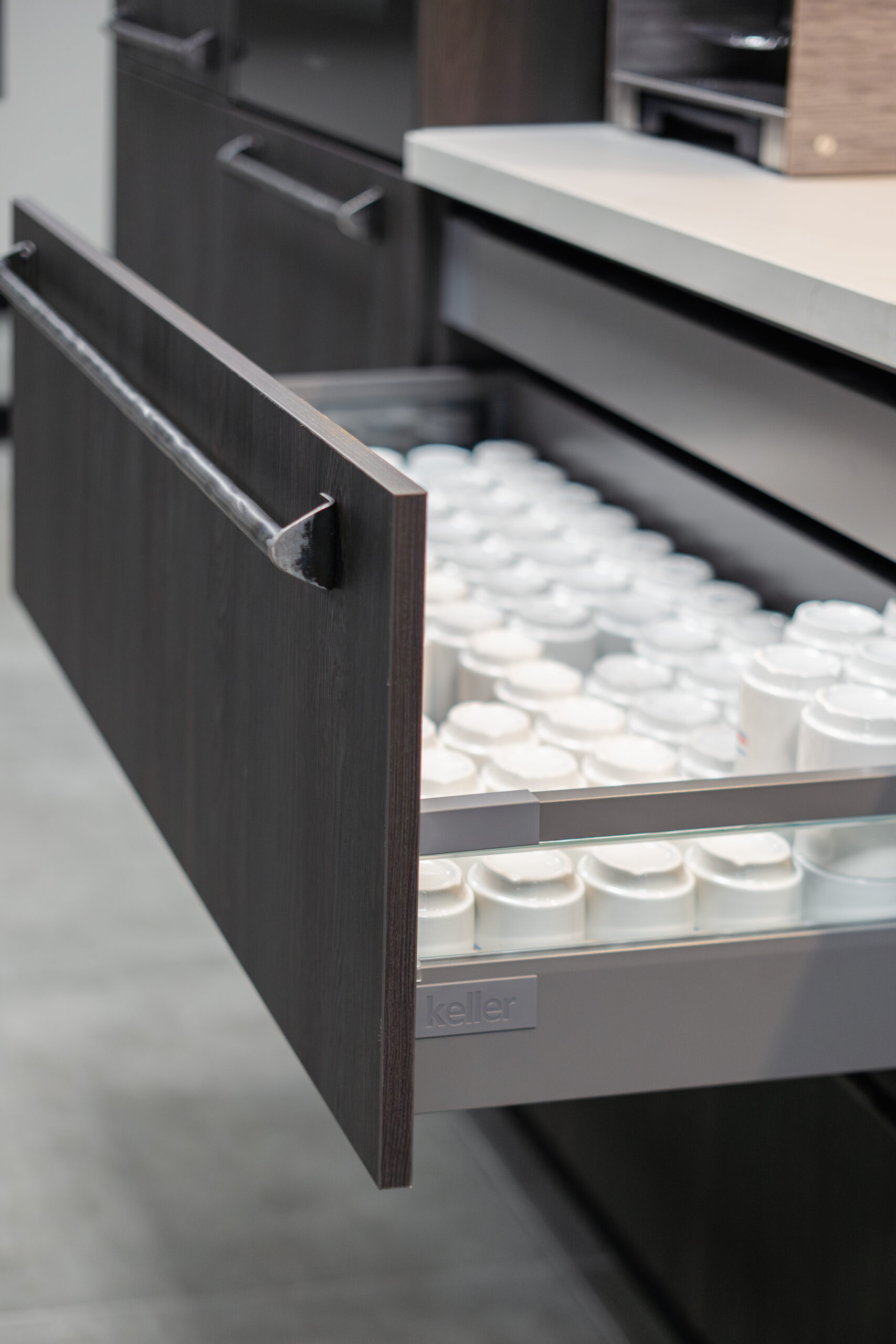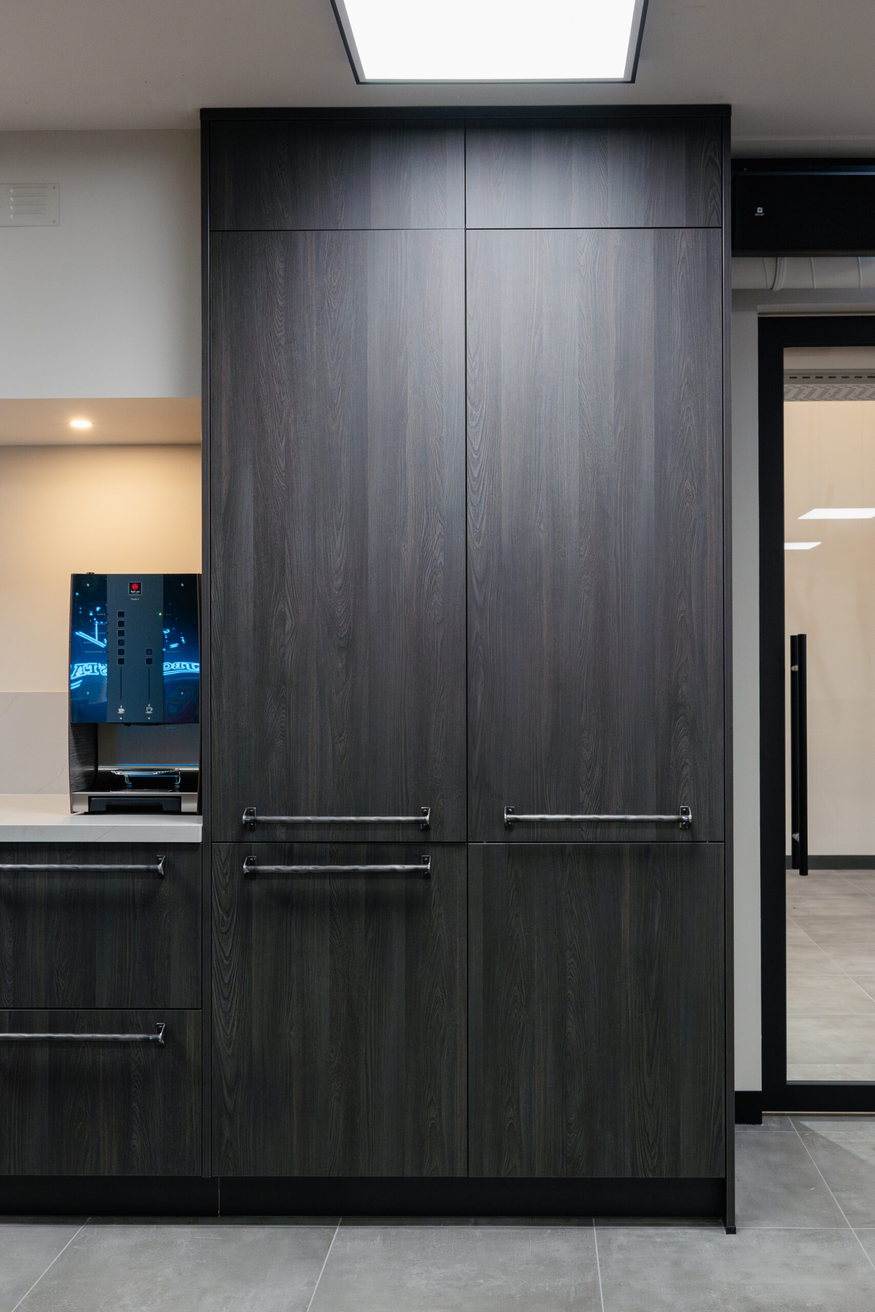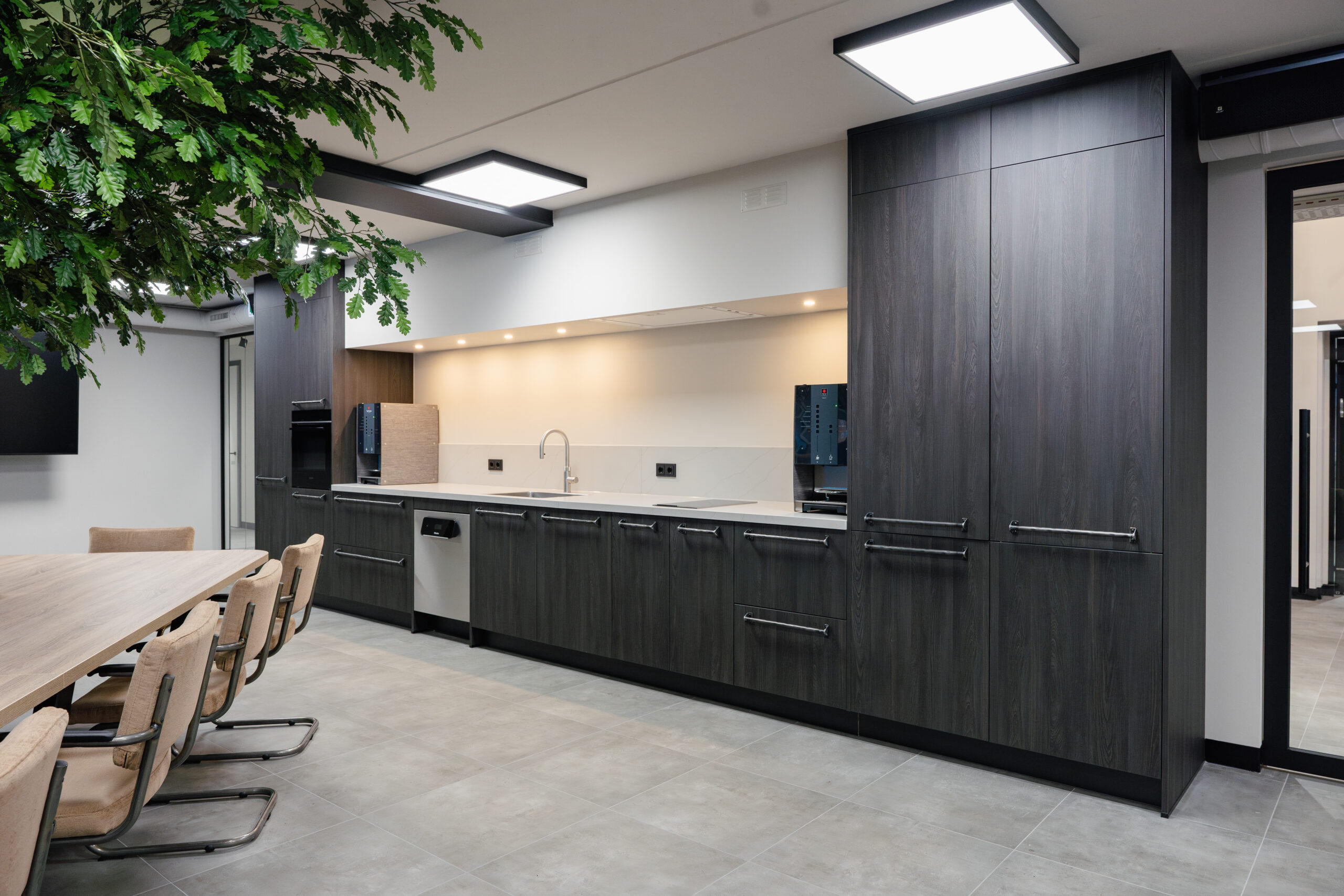 Met deze uitgangspunten gingen we aan de slag. Het definitieve ontwerp werd een robuuste keuken met zwarte houtmotief fronten, afgewerkt met stoere grepen die perfect passen bij de industriële uitstraling van Nijborg Staal. Het werkblad is gemaakt van grijs composiet, niet alleen stijlvol, maar ook praktisch dankzij de geïntegreerde smetrand die zorgt voor eenvoudig onderhoud en duurzaamheid.