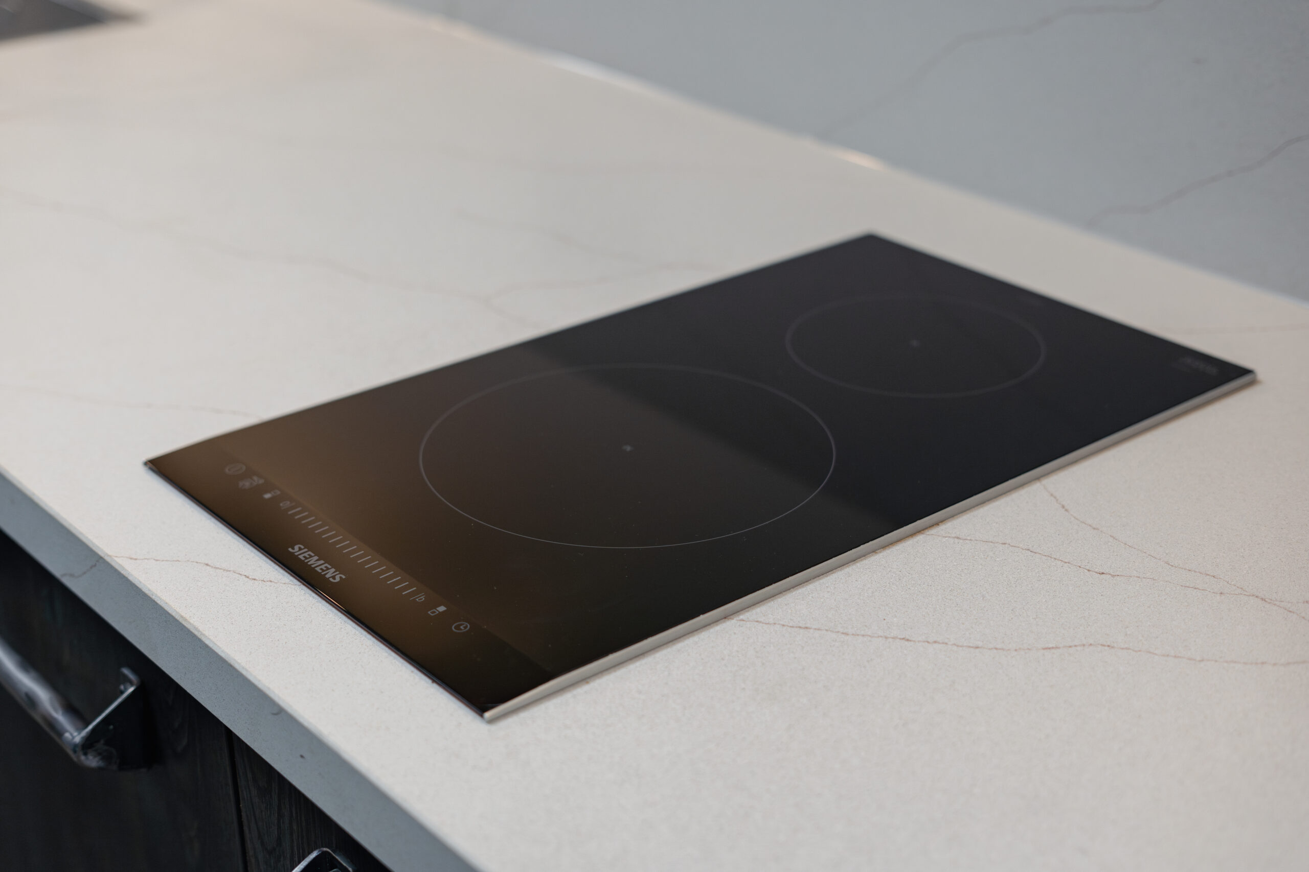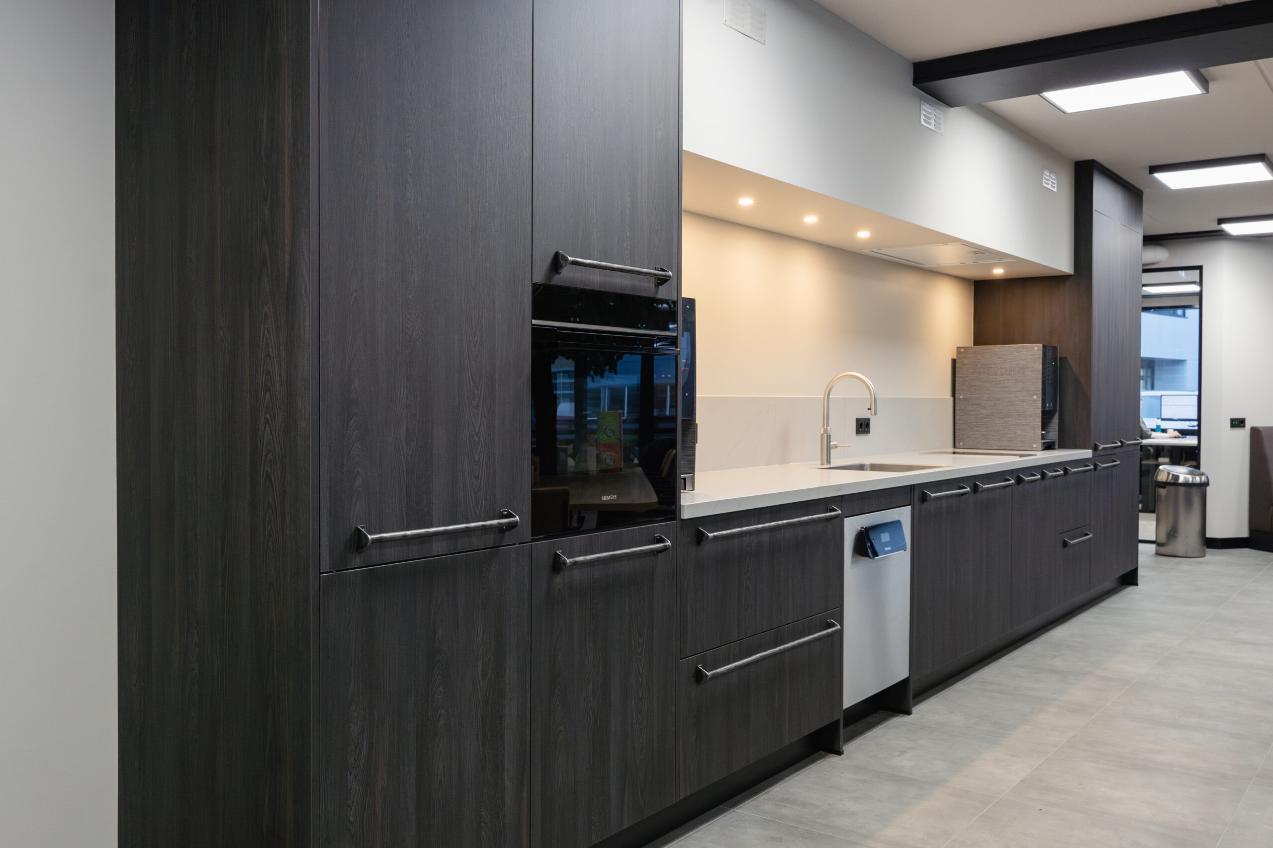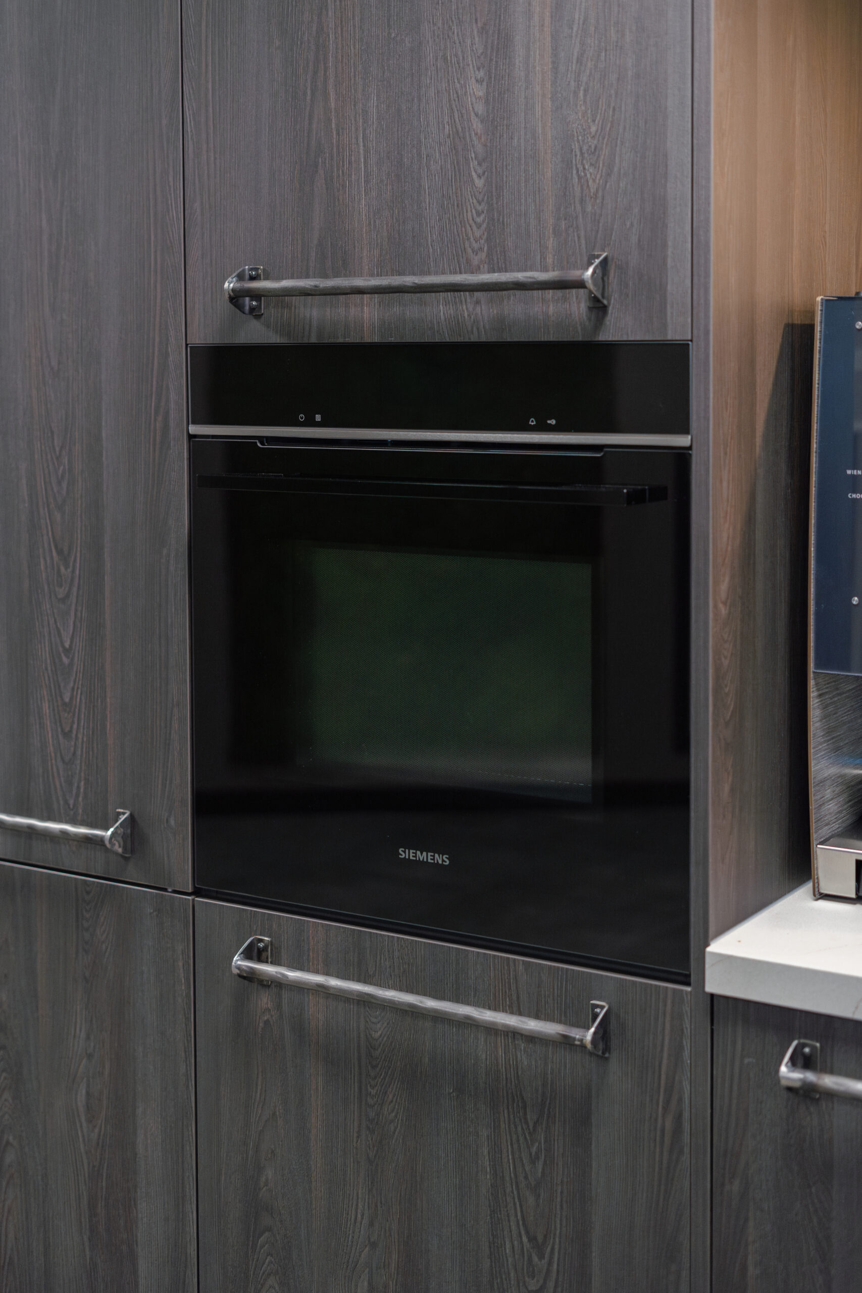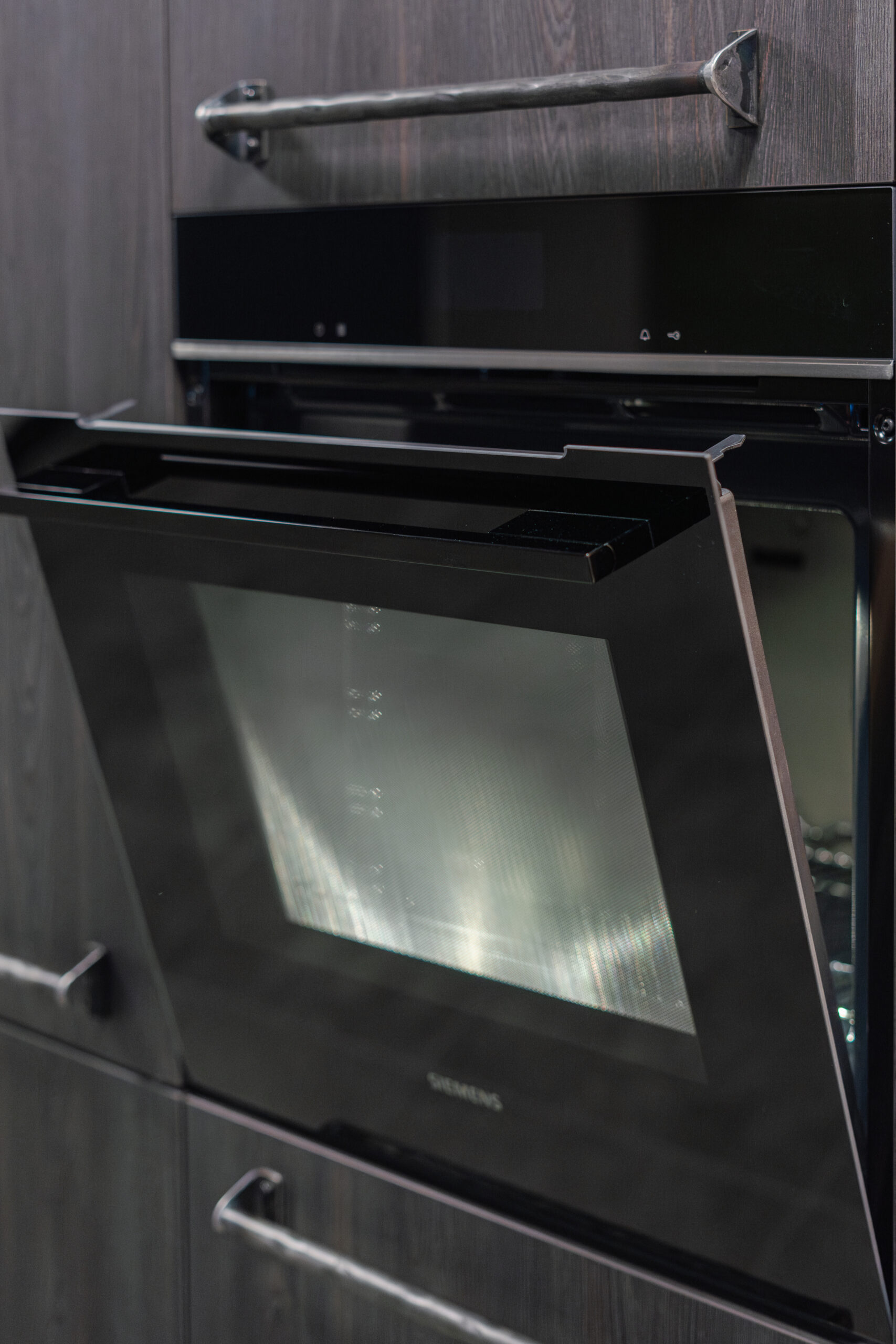 Met deze uitgangspunten gingen we aan de slag. Het definitieve ontwerp werd een robuuste keuken met zwarte houtmotief fronten, afgewerkt met stoere grepen die perfect passen bij de industriële uitstraling van Nijborg Staal. Het werkblad is gemaakt van grijs composiet, niet alleen stijlvol, maar ook praktisch dankzij de geïntegreerde smetrand die zorgt voor eenvoudig onderhoud en duurzaamheid.